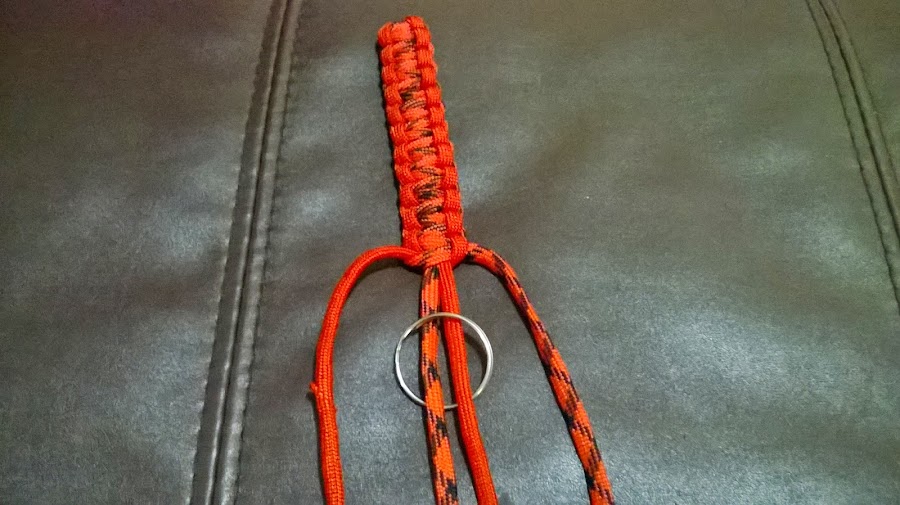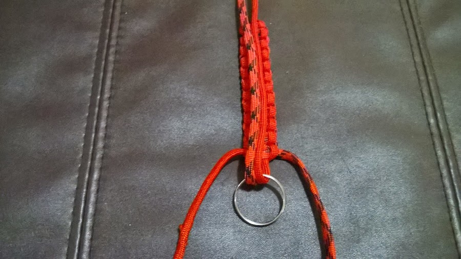 Paso 6. Continúa el tejido hasta obtener el largo que deseas, y pasas la argolla del llavero por los cordones del centro. Coloca los cordones hacia arriba de la argolla y puedes continuar tejiendo hasta donde desees que llegue el largo del llavero.
